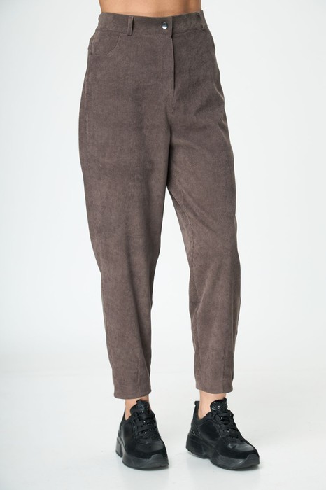 Зауженные книзу за счёт вытачек по передним и задним частям. На передних частях брюк обработаны карманы с отрезным бочком.