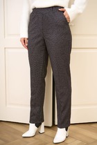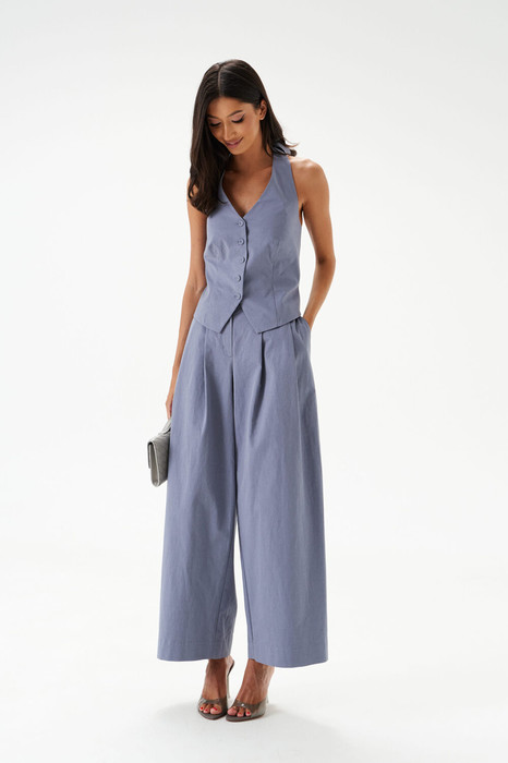 Брюки свободного кроя. Выполнены из хлопкового полотна серо-голубого цвета. Пояс по переду стабильный, пояс по спинке на резинке. По переду от пояса складки. В боковых швах карманы с отрезным бочком. По заднему полотну накладные клапаны (имитация карманов). Застёжка центральная; молния, пуговица. Длина по боковому шву 102 см. Брюки дополнит жилет А5483