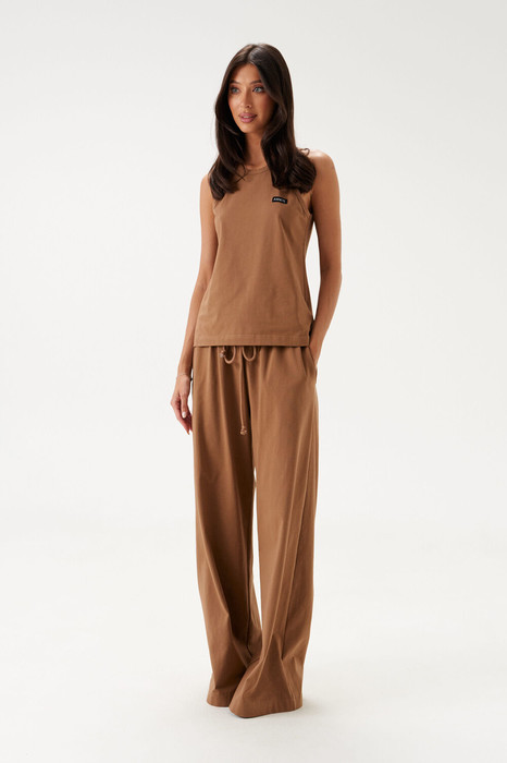 Брюки прямого, свободного кроя выполнены из трикотажного полотна.Характеристики: прямой крой, пояс на резинке с кулиской, в боковых швах карманы. Длина брюк 109 см.