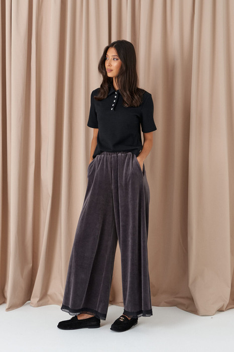 Брюки свободного кроя, выполнены из мягко полотна велюра графитового цвета. Характеристика: свободный корой, пояс на резинке, по низу брюк черное кружево. Длина брюк по боковому шву с учётом кружева 101 см.