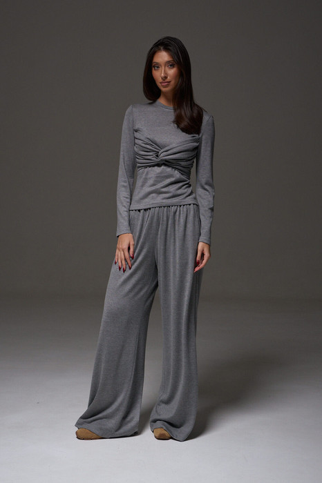 Брюки прямого, свободного кроя выполнены из трикотажного полотна серого цвета. Характеристики: прямой крой, пояс на резинке, в боковых швах карманы. Длина брюк 107 см.