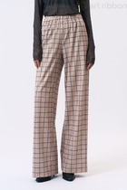 Брюки прямого кроя выполнены из костюмной ткани голубого цвета в узкую бежевую полоску. Характеристики: прямой крой, пояс на широкой резинке, боковые карманы, на передних и задних частях брюк заутюжены стрелки, без подкладки. Длина брюк по боковому шву 112 см.