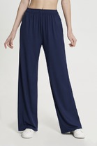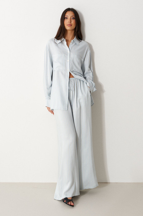 Брюки свободного кроя. Выполнены из мягкой струящейся ткани голубого цвета с белой полоской. Пояс на резинке, со шнурочком. В боковых швах карманы. Длина бокового шва (с учётом пояса) 107 см