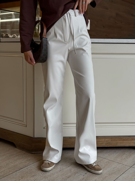 Эти брюки станут глотком свежего воздуха среди широких силуэтов и брюк палаццо. Их облегающий крой подчёркивает линию бедёр и тали, а затем изящно расклешается от колена.Такой фасон позволит скорректировать фигуру. Выполнены из практичной экокожи. Удобство в уходе позволяет носить их в самые слякотные дни.