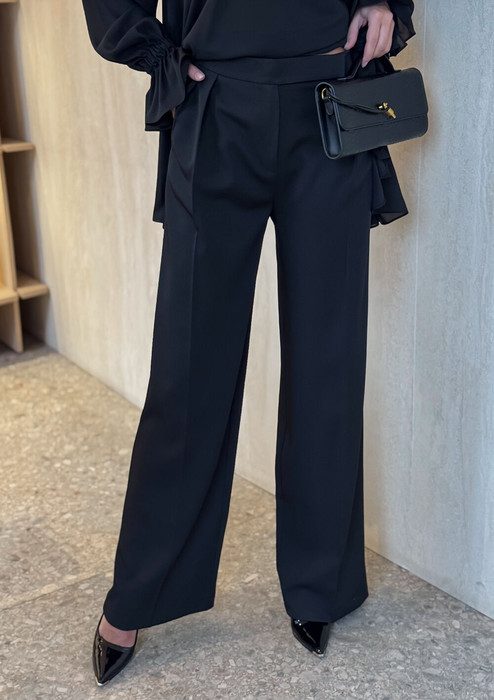 Широкие брюки в классическом черном цвете сочетают в себе элегантность и удобство и станут эффектной детальюбазового гардероба. Своболный крой не ковыает движений, а завышенная талия подчеркнут фигуру. Складки доавляют образу элегантность. Застёжка  на потайные  кнопки без лишнего визуального шума.
