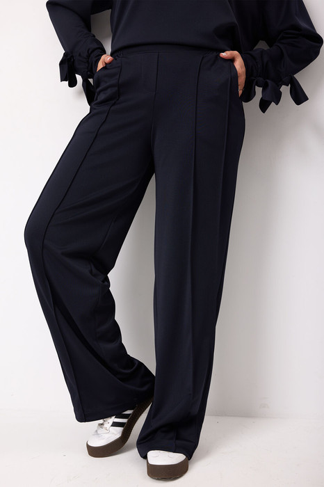 Брюки свободного кроя с притачным поясом на резинке с островком. Спереди и сзади расположены две застроченные стрелки. Это конструктивное решение позволяет сделать посадку идеальной и визуально удлинить ножки. По бокам брюк - карманы хулиганы. Низ обработан подгибкой.