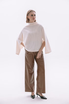 Брюки классические, прямые, слегка заужены к низу, по переду обработаны карманы с отрезным бочком, застежка на тесьму-молнию и 1 пуговицу. На задних половинках обработаны вытачки и имитация карманов в рамку с двумя обтачками, пояс в брюках притачной. По низу брюк в боковом шве есть небольшой разрез. Длина брюк от талии по боковому шву 97 см.