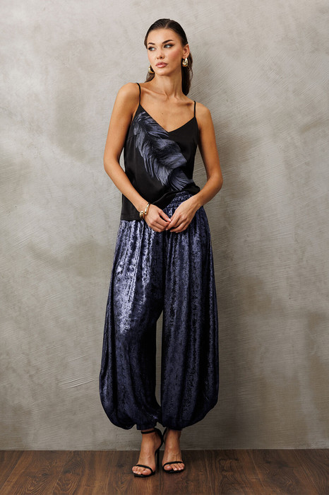 Брюки-шаровары свободного силуэта, внизу на резинке, на притачном отсроченном поясе, со вставленной в него резинкой. Полочка с карманом в рельефе. По переду и спинке фигурные рельефы.