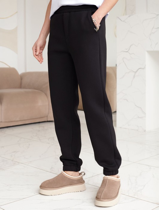 Эти уютные брюки черного цвета созданы для вашего комфорта. Стильные спортивные штаны из натурального материала и правильного кроя подойдут для девушек и женщин любого размера, в том числе на плюс-сайз фигуру. Зауженные к низу брюки отлично вытянут силуэт и скроют недостатки за счет правильного кроя.