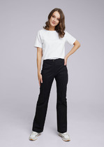Брюки прямого силуэта, выполнены из костюмной ткани с вискозой. Верх оформлен притачным поясом с застежкой на петлю-пуговицу, резинкой по бокам и шлевками. Перед с карманами и заутюженными «стрелками».