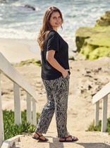 Брюки женские из трикотажного полотна «бурумчук» (шелковый креп) с набивным рисунком, прямого кроя, свободные, с карманами в боковых швах, на притачном поясе с эластичной тесьмой внутри.