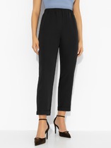 Брюки классические с заутюженными стрелками, слегка зауженные к низу, оформлены притачным поясом, частично на резинке. Застежка спереди брюк на молнию и петлю-пуговицу