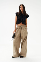 Брюки — прямого свободного кроя с завышенной посадкой. Идеально садятся по фигуре и создают изящную вертикаль, визуально удлиняя ноги.