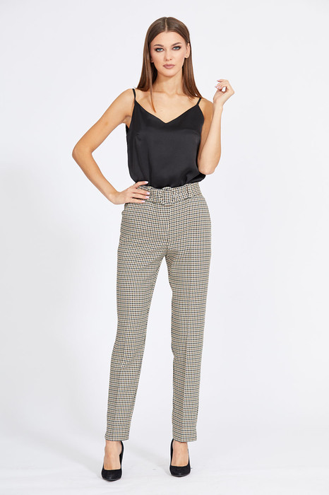 Брюки  выполнены из костюмной ткани с рисунком "гусиная лапка", слегка заужены к низу, в наружных боковых швах выполнены разрезы. Карманы в боковых швах. Застежка спереди на молнию. Пояс широкий со шлевками.  Пояс с обтяжной пряжкой идет в комплекте.