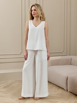 Брюки – женские из гладкокрашенного трикотажного фактурного полотна в «рубчик» с добавлением ангоры, полуприлегающего силуэта, длинные, слегка расширенные книзу, на притачном поясе с эластичной тесьмой внутри.