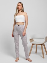 Брюки женские из трикотажного полотна «кулирка» с набивным рисунком, прямого кроя слегка зауженные книзу, с карманами в боковых швах, на притачном поясе с эластичной тесьмой внутри.
