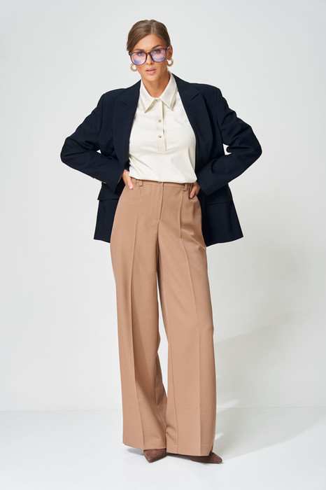 Брюки палаццо с притачным поясом из костюмной ткани. Спереди застежка гульфик на молнии и петлей и пуговицей по поясу. По задней частям брюк вытачки. Пояс с резинкой в боковых частях. Брюки с заутюженными стрелками. Длина брюк с учетом пояса - 109 см. Данная модель прекрасно сочетается с другими моделями из нашей коллекции 15408, 15363 и 15317/1. Создайте гармоничный образ, комбинируя эти изделия!