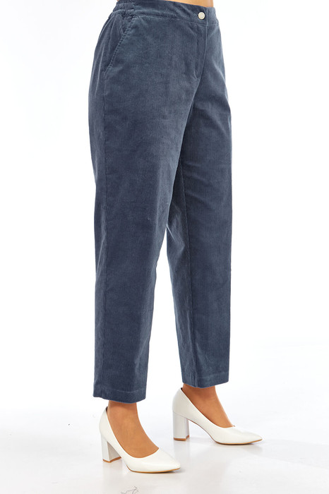 "Брюки женские, свободного силуэта, выполнены из хлопкового вельвета. Пояс притачной, частично на резинке. Застежка на молнию, петлю и пуговицу. В передних деталях брюк обработаны боковые карманы с подрезным бочком.