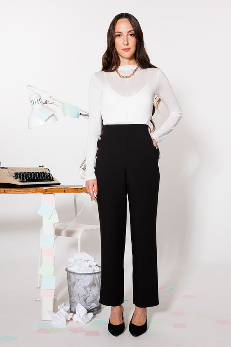 Прямые брюки на резинке  - это сдержанность и лаконичность. Золотые дизайнерские пуговицы вдоль линии карманов, пояс сзади на резинке, это красота и удобство в одном флаконе. Это лучшие брюки для любого гардероба. Длина изделия – 100 см.