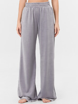 Брюки женские из гладкокрашеного тканого штапельного полотна, свободного покроя, удлиненные, с карманами в бокавых швах, на притачном поясе с эластичной тесьмой внутри.
