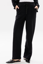 Удобные повседневные брюки из лёгкой ткани с вискозой в составе. Брюки свободного прилегания по бедрам и зауженные к низу. Пояс на эластичной тесьме с кулисой и втянутым шнурком. Вход в карман фигурный, наклонный к боковому шву.