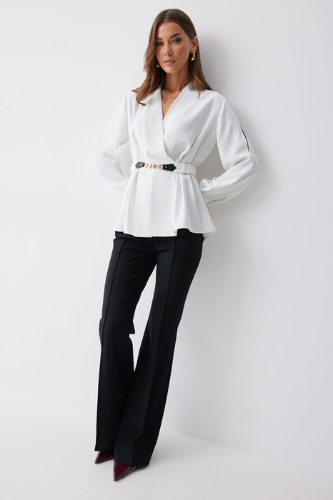 Брюки прямого силуэта с защипами из трикотажного полотна. По верху брюк притачной пояс и центральная застежка на петли и пуговицы. На передних половинках защипы и декоративные листочки. На задних половинках брюк накладные карманы. Обращаем ваше внимание, что фурнитура может отличаться от фото.