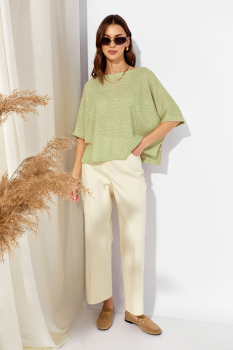 Брюки полуприлегающего силуэта из джинсовой ткани. По верху брюк притачной пояс со шлевками для ремня. На передних половинках обработаны карманы, декоративные защипы и застежка молния в среднем шве, на задних –кокетка и карманы. По поясу задних половинок брюк эластичная тесьма (резинка). Обращаем ваше внимание, что фурнитура может отличаться от фото.