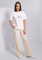 Брюки прямого силуэта из струящейся ткани. По верху брюк притачная декоративная резинка. По переду обработаны карманы в боковых швах и декоративные складки. На задних половинках брюк листочки. Обращаем ваше внимание, что фурнитура может отличаться от фото.