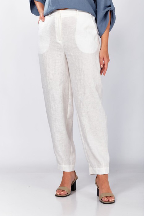 Брюки женские.Спереди застёжка на молнию и пуговицу.Сзади вытачки. В боковых швах карманы с отрезным бочком.Пояс по спинке на резинке , дополнен шлёвками.По низу брюк вытачки, создающие зауженный эффект.