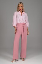 Брюки свободного кроя, верхний срез представлен широкой резинкой, с карманами.