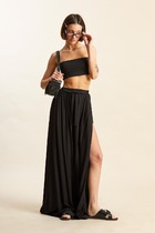 Брюки свободного кроя из гладкой ткани сочетают элегантность и комфорт. Широкая резинка на поясе и наличие функциональных карманов подчеркивают удобство модели.