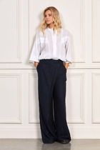 Брюки женские из трикотажного полотна «футер-двунитка», длинные, полуприлегающего силуэта, на притачном поясе с эластичной тесьмой внутри и карманами в боковых швах. Передние половины застрочены по центральным линиям, на задних половинах обработаны две вытачки в области талии.
