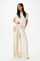 Текстильные брюки-палаццо с высокой посадкой. Детали: высокая посадка, широкие и длинные брюки, притачной пояс со шлевками, передние половины с небольшими застроченными мягкими складками и заутюженными стрелками, застежка на молнию и пуговицу, боковые карманы