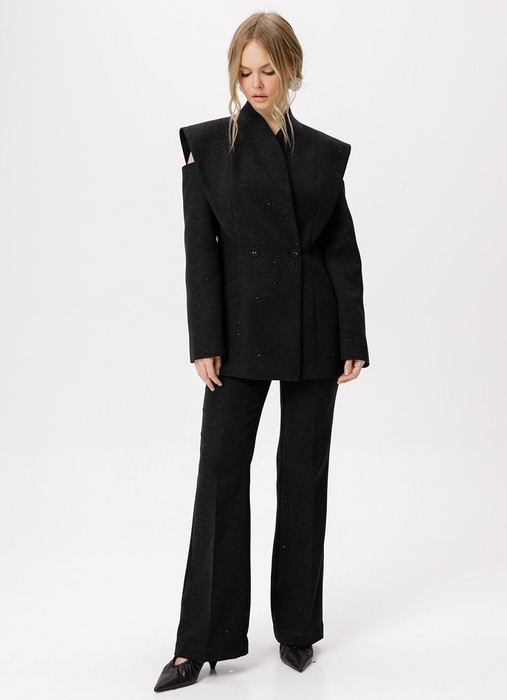Детали: притачной пояс со шлевками, передние половины с заутюженными стрелками, застежка на молнию и потайные крючки, боковые карманы. Задние части брюк с вытачками и заутюженными стрелками. Пояс брюк без резинки.