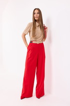 Модель прямого силуэта, на подкройном поясе, со шлёвками. Пояс частично собран на резину. Застёжка на молнию, потайную пуговицу и крючки на поясе. Спереди карманы в подрезных бочках. Сзади прорезной карман в рамку с клапаном. Ремень в комплект не входит.