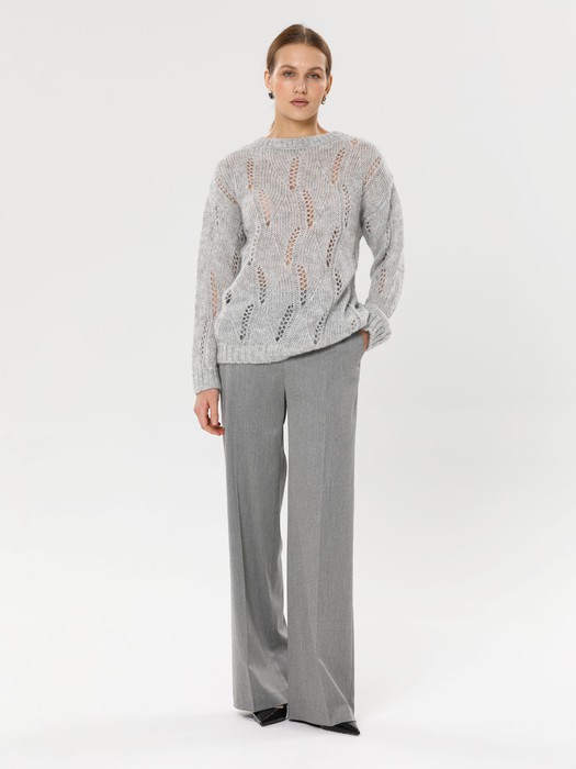 Модель прямого силуэта. Пояс комбинированный, со шлёвками, сзади собран на резину. Спереди карманы в подрезных бочках. Застёжка на молнию и крючки на поясе. Сзади прорезной карман с листочкой и застёжкой на пуговицу. Ремень в комплект не входит.