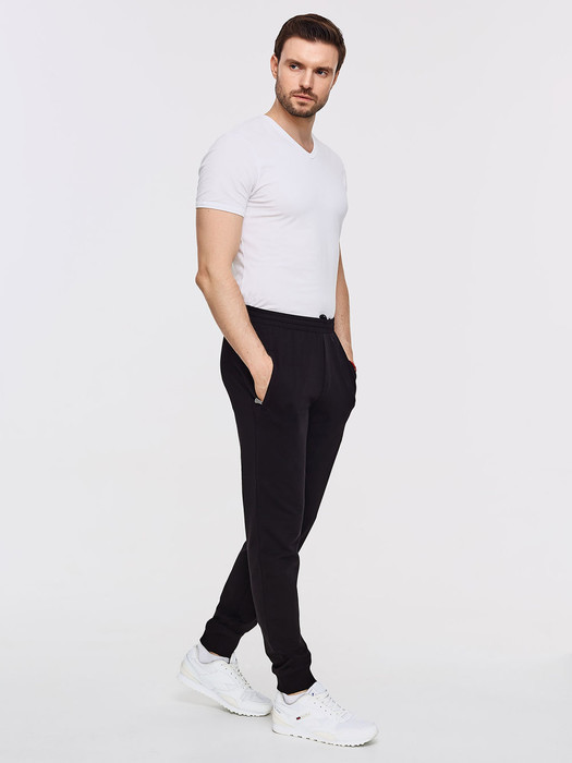 Брюки мужские из хлопкового трикотажного полотна на манжетах из рибаны. На передних половинках карманы с листочкой на молнии. Пояс по талии регулируется шнурком. Под карманом на правой половинке настрочен шеврон с фирменным логотипом.