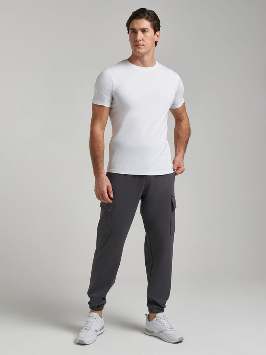 Брюки мужские из хлопкового трикотажного полотна в стиле "карго". Верхние карманы прорезные с листочками. Ниже по бокам брюк есть дополнительные объемные накладные карманы с клапанами. Низ брюк присобран на эластичную резину. Пояс по талии регулируется шнуром.