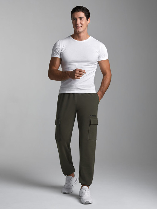 Брюки мужские из хлопкового трикотажного полотна в стиле "карго". Верхние карманы прорезные с листочками. Ниже по бокам брюк есть дополнительные объемные накладные карманы с клапанами. Низ брюк присобран на эластичную резину. Пояс по талии регулируется шнуром.