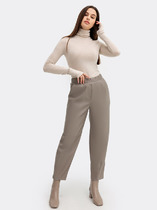 Брюки женские, длинные. По задним половинам талиевые вытачки и цельнокроеный пояс. По передним половинам односторонние складки частично застроченные, карманы фигурной формы. По задним и передним половинам заутюжены стрелки. В среднем шве обработана застежка на тесьму-«молнию». Верхний срез передних половин обработан притачным поясом. По спинке, между вытачками вставлена резинка.