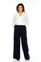 Брюки женские из текстильной ткани свободного силуэта с высокой посадкой!!! ("брюки-бананы"). По переду расположены карманы. На задней половинке отрезная кокетка и накладные карманы. Пояс притачной со шлевками.  По спинке вставлена резинка. Застежка-гульфик на молнию и пуговицу.