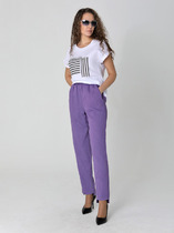 Брюки женские из текстильной ткани, слегка заужены к низу. В боковых швах расположены карманы. По низу передних половинок есть защип. Задняя половинка брюк с отрезной кокеткой и накладными карманами. Вверх брюк обработан поясом с резинкой (без молнии).  ПОЯС  ВХОДИТ В КОМПЛЕКТ.