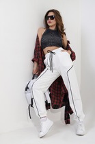 Брюки молодежные из трикотажного полотна «футер двунитка» с лайкрой, длинные, на притачном поясе с эластичной тесьмой внутри и шнурком, продетым через две петли в центре пояса, с карманами в боковых швах и эластичной тесьмой по низу. Правая половина брюк – из трех частей, левая - из двух частей фигурной формы, с кантом контрастного цвета в соединительных швах. На правой половине по горизонтальному шву настрочен декоративный элемент.