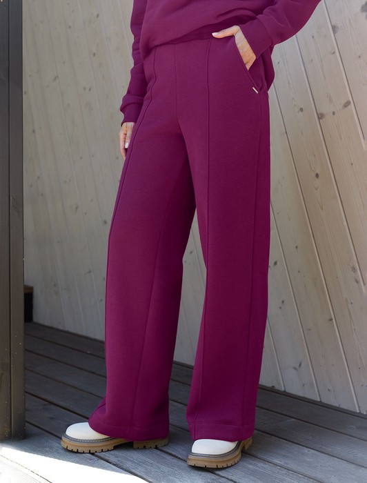 Эти уютные брюки стильного пурпурного цвета созданы для вашего комфорта. Свободный прямой крой обеспечивает свободу движений и максимальное удобство в любых ситуациях, поэтому они подойдут и на большие размеры, а так же на высокий или низкий рост. Фигура подчеркивается, а силуэт визуально вытягивается за счет кроя палаццо и застроченных декоративных стрелок.