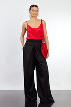 Брюки классической формы, зауженные к низу со стрелками по передним и задним половинкам. По низу брюк манжеты. Верхний срез брюк обработан поясом с резинкой по боковым швам. На задних половинках расположены талиевые вытачки, в боковых швах – наклонные карманы. Перед обработан поясом фигурной формы и декоративным клапаном, на котором пришита пуговица. В комплект входит контрастный узкий ремень.