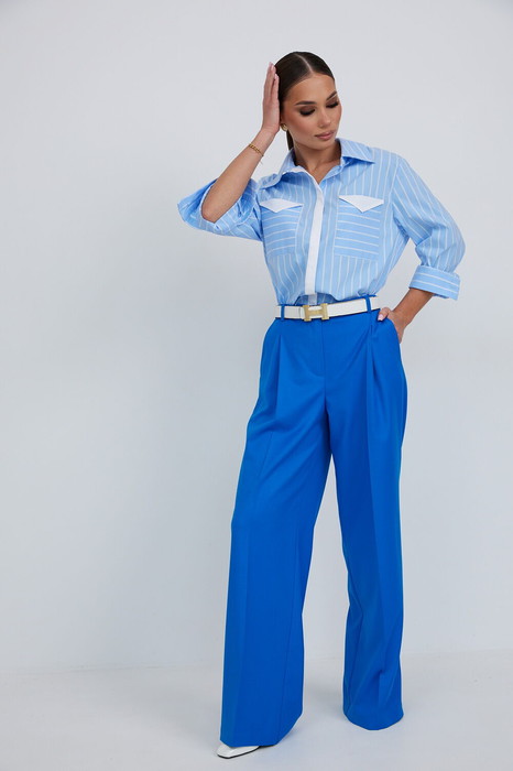 Брюки прямые из костюмной ткани. Верх на поясе со шлевками. Ширинка на молнии и удлиненный пояс со скрытой застежкой на пуговицу и крючок. Складки спереди, диагональные боковые карманы и задние прорезные листочки.