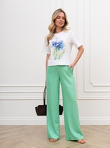 Брюки клёш из джинсовой ткани. Верх на притачном поясе со шлёвками. Высокая посадка. Застёжка спереди на петли и пуговицы-болты. По переду боковые карманы. По задней части кокетка и накладные карманы. Отделка контрастной нитью.