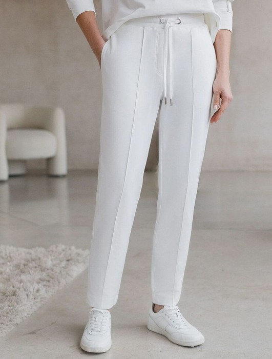 Брюки белого цвета зауженного кроя выполнены из премиального футера-двухнитки. Лаконичный силуэт поддерживают застроченные стрелки, зрительно вытягивающие силуэт. Удобный пояс на резинке регулируется хлопковым шнурком с золотистой фурнитурой. Наличие эластана в составе изделия гарантирует комфорт и долговечность изделия. Эластичный материал хорошо пропускает воздух, позволяя телу дышать, и легко тянется, не ограничивая движения.