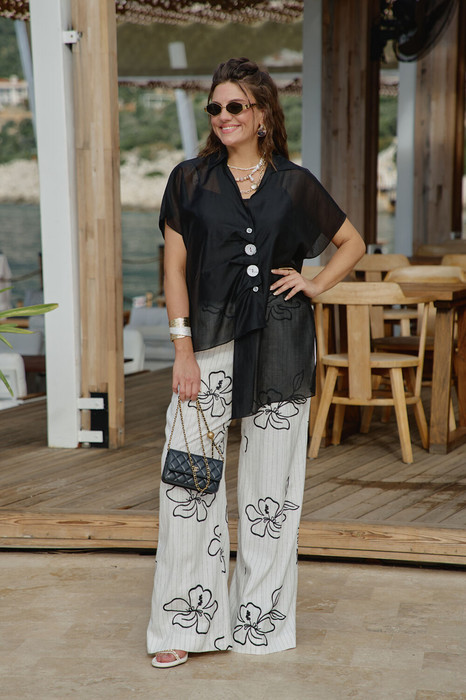 Брюки прямого силуэта, с притачным поясом со вставкой эластичной тесьмы-резинки в бочках, застёжкой на тесьму-молнию в гульфике и пуговицу в поясе. В боковых швах брюк прорезные карманы. Черные полоски плавно в сочетании с цветочными узорами добавляют в комплект легкость и игривость, превращая его в настоящее произведение искусства. Брюки на подкладке. Обращаем Ваше внимание, что фурнитура может незначительно отличаться от фото.  Длина брюки по боковому шву 108 см.