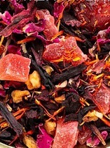 Ярко выраженное восточное благоухание зелёного китайского крупнолистового чая дополняется за счет кусочков спелых плодов ананаса, приправленных соцветиями мальвы, сафлора, красной розы и календулы.